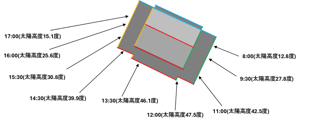 赤外線調査計画では、建物の傾きに合わせて、太陽方位・太陽高度を計算して当日の撮影スケジュールを決めます。30分~1時間ずれるだけで、劣化の検知率が下がるため大切な工程です。