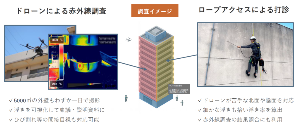 ドローンによる赤外線調査と、ロープアクセス等による打診調査を組み合わせたハイブリッド調査を行います。